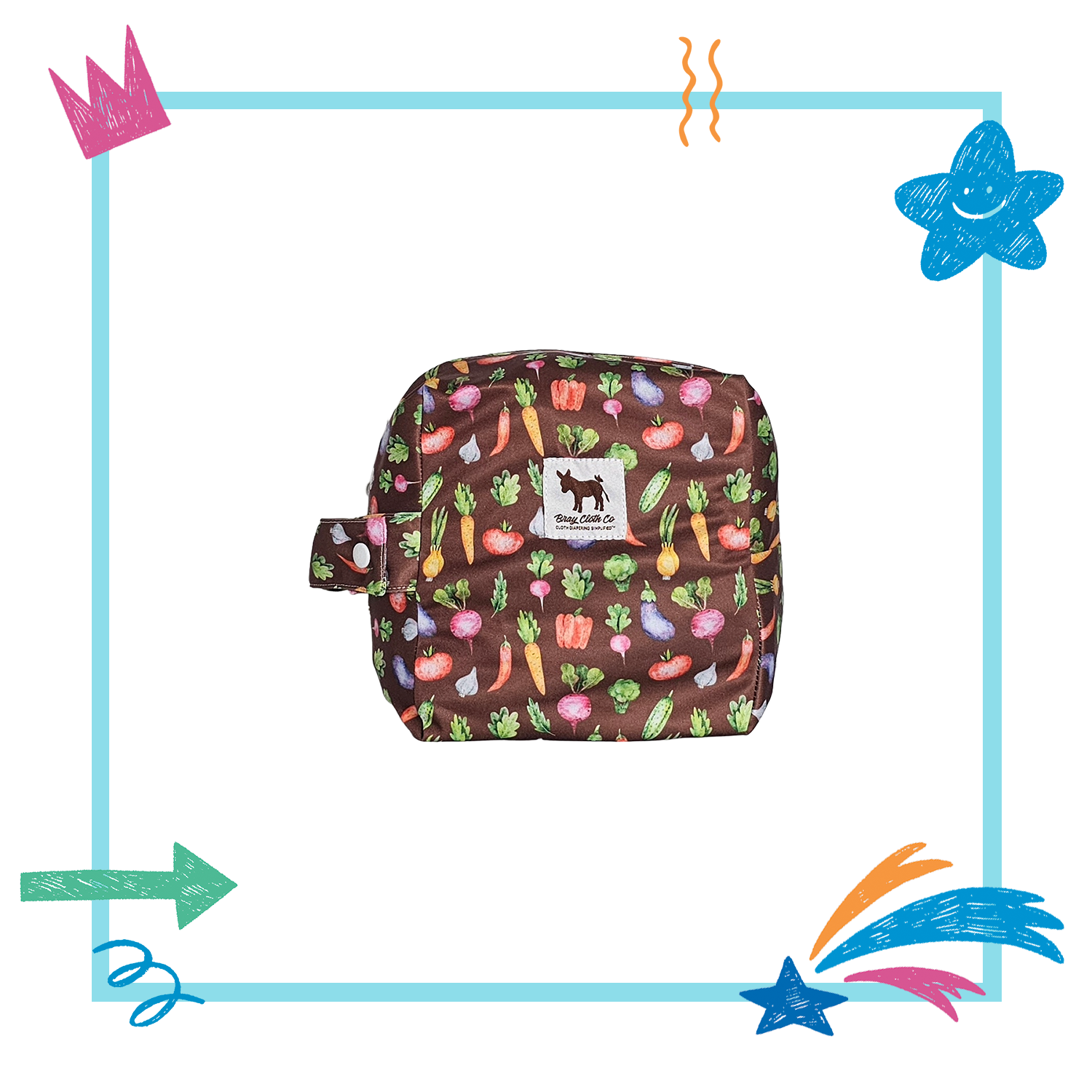 A custom sized pod double lined pul so its waterproof, features a hand carrying strap for carrying on one end. Fits up to 6 stuffed diapers inside.