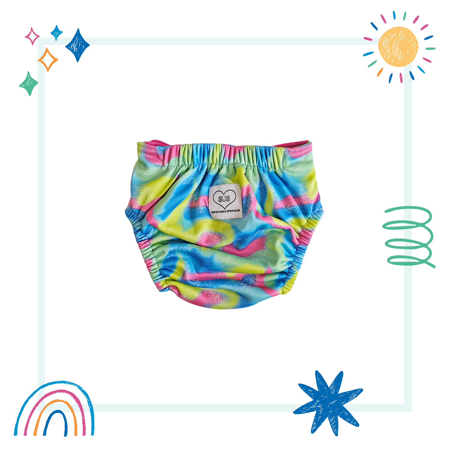 Our midsize swim bottoms are made to be body conforming so there is no excess fabric to sag or hold water. Our outer printed material has no pul so water can pass through and is lined with 2 layers of athletic wicking jersey to catch any solids.